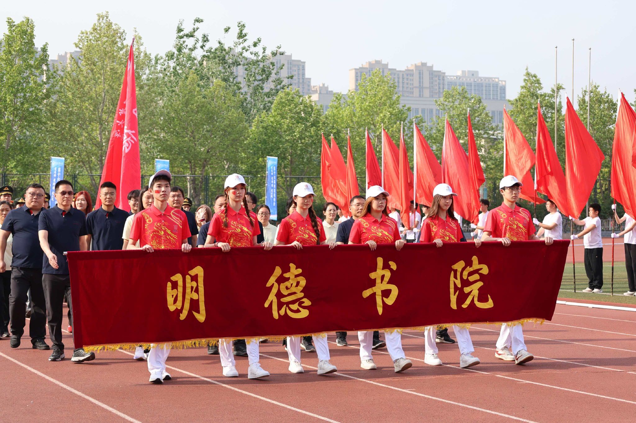 运动会开幕式上,明德书院方阵身着统一服装,队列整齐、步伐铿锵,伴随着激昂的运动员进行曲稳步走过主席台。学子们口号嘹亮、身姿挺拔,精神饱满、气势昂扬,充分展现出书院学子朝气蓬勃、锐意进取的青春风采。庄严的升国旗、奏唱国歌,运动员与裁判员代表宣誓等环节依次进行,热烈庄重的氛围为全体运动健儿拉开奋勇拼搏的序幕。