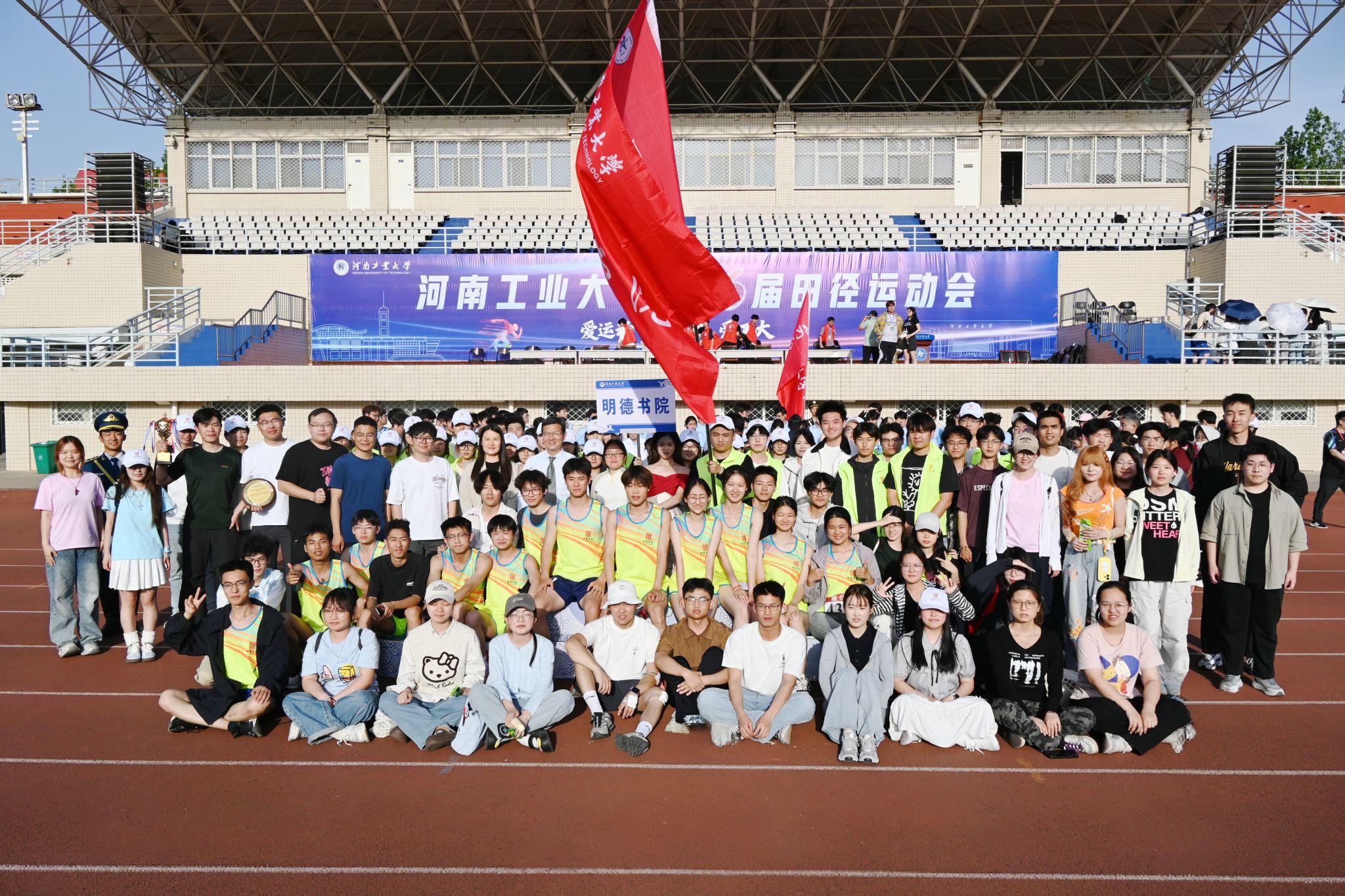 青春逐梦赛场,拼搏闪耀明德。4月15日至17日,河南工业大学第十六届田径运动会在莲花街校区田径场隆重举行。为期三天的激烈角逐中,明德书院代表队意气风发、奋勇争先,在各项赛事中全力以赴、突破自我,充分展现出强劲竞技实力与昂扬精神风貌,最终荣获学生组第三名与体育道德风尚奖第一名,用汗水与拼搏书写青春答卷,彰显书院制育人的丰硕成果。