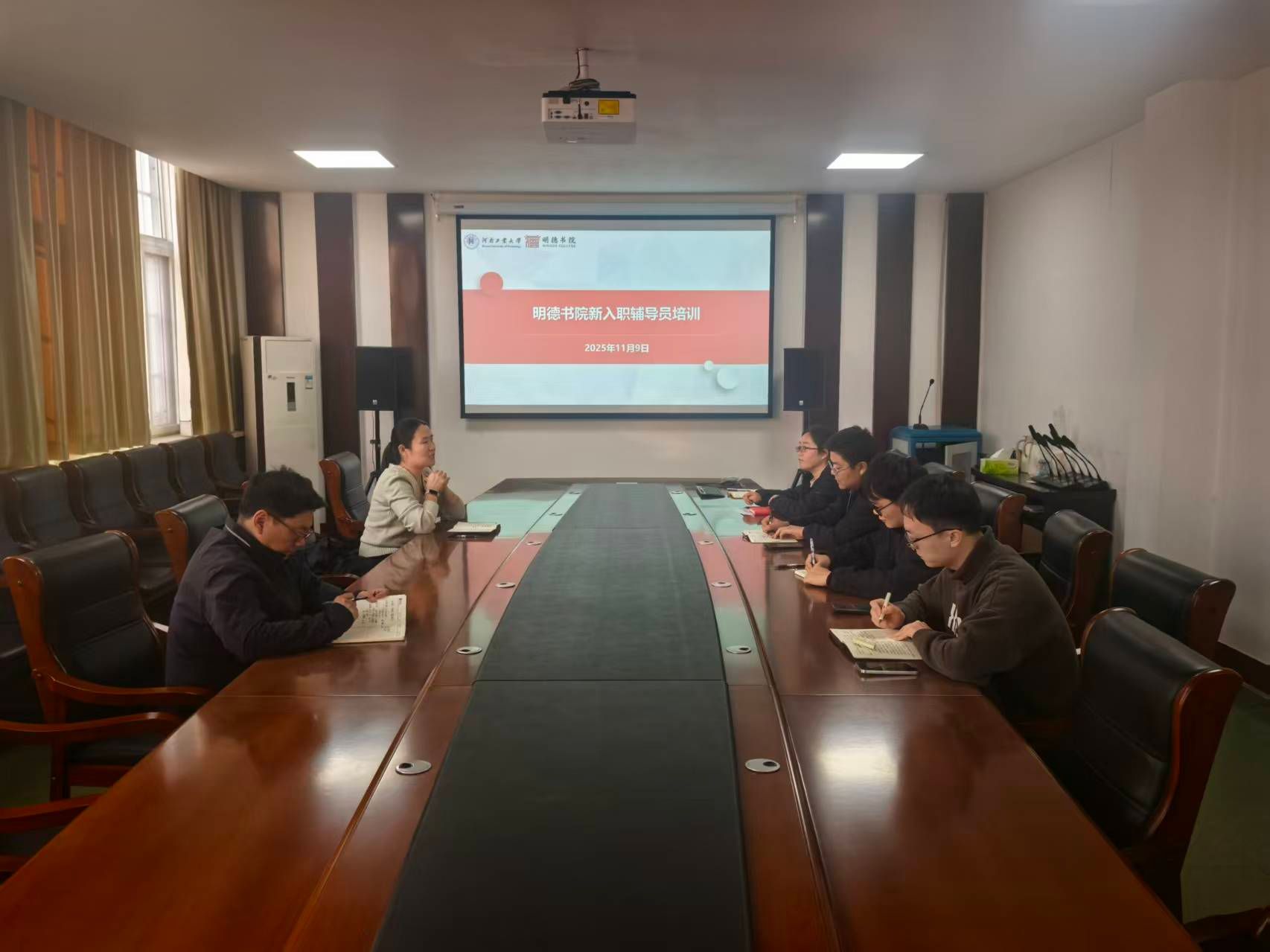 为助力2025年新入职辅导员快速适应岗位需求,提升业务能力,11月9日下午,明德书院在207会议室组织开展了新入职辅导员培训活动。本次培训由书院党委副书记、纪委书记刘飞翔和 党委副书记杨二瑞主讲,旨在为乔磊、李峥、李国根三位新入职辅导员提供系统的工作指导和经验分享。团委书记刘振伟、学工办主任薛晓晓参加本次培训。