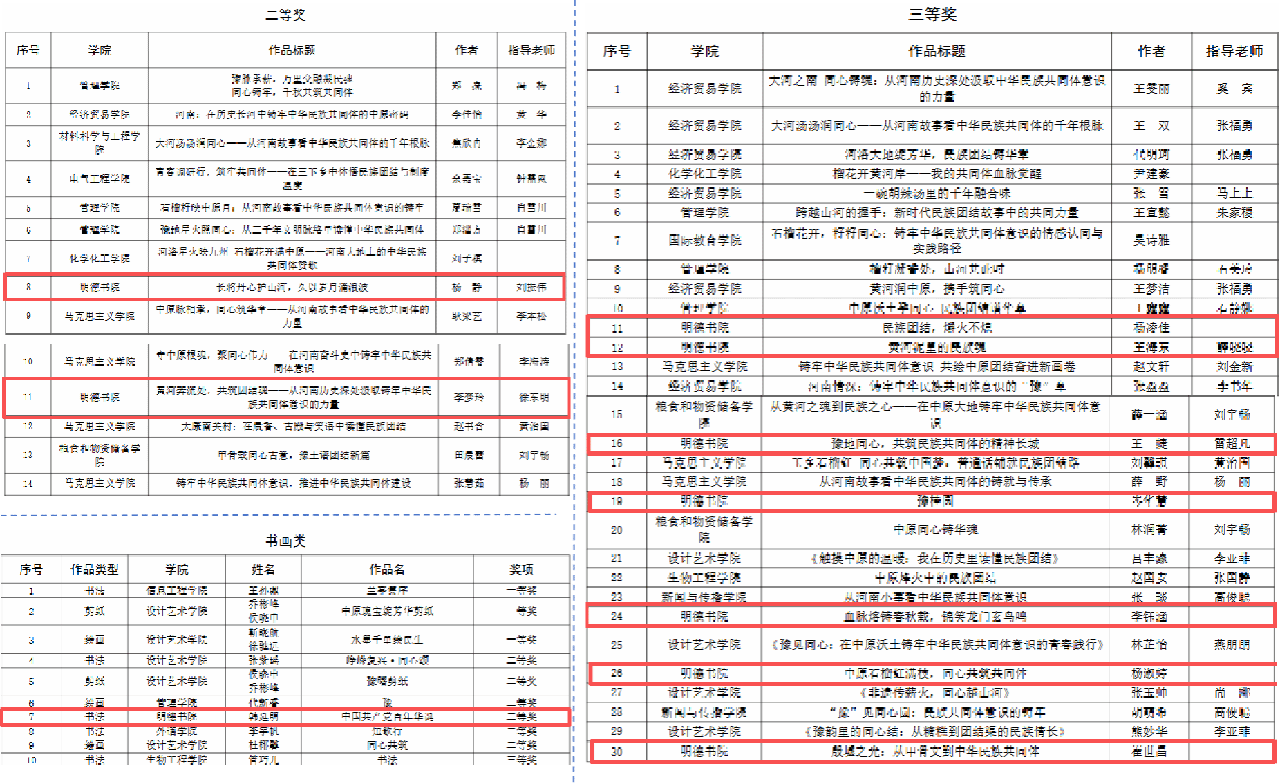 在“铸牢中华民族共同体意识”主题征文比赛中,书院学子更是文采飞扬,捷报频传。杨静、李梦玲荣获二等奖;杨凌佳、王海东、王婕、岑华慧、李钰涵、杨淑婷、崔世昌等七位同学获得三等奖。同学们以笔墨抒发家国情怀,字里行间洋溢着对中华民族的强烈认同与自豪。
