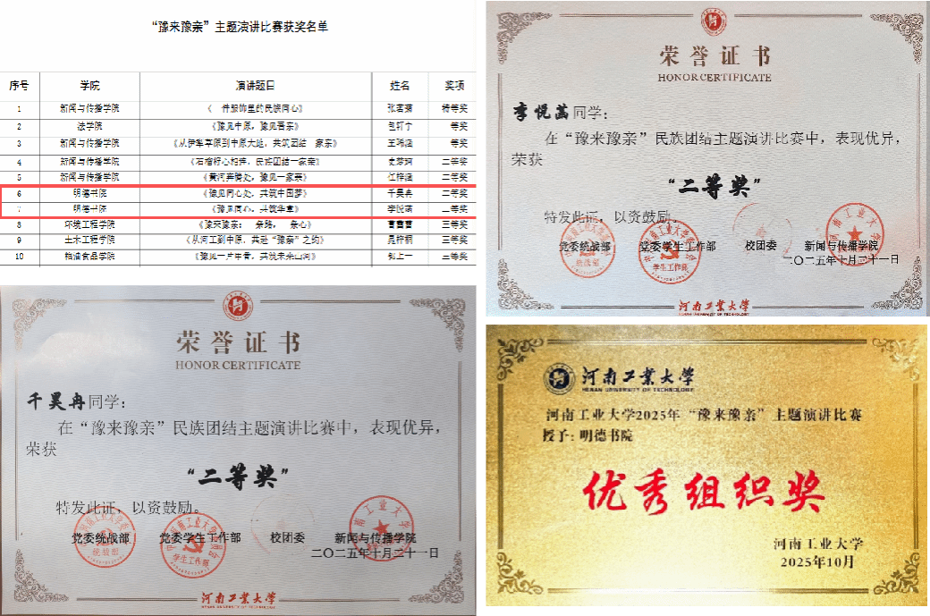 在备受瞩目的“豫来豫亲”主题演讲比赛中,明德书院选送的2025级学子发挥出色。25级电气专业的千昊冉和播音专业的李悦菡凭借其真挚的情感和精彩的讲述,双双荣获二等奖,用青春之声生动诠释了“中华民族一家亲”的深厚内涵。