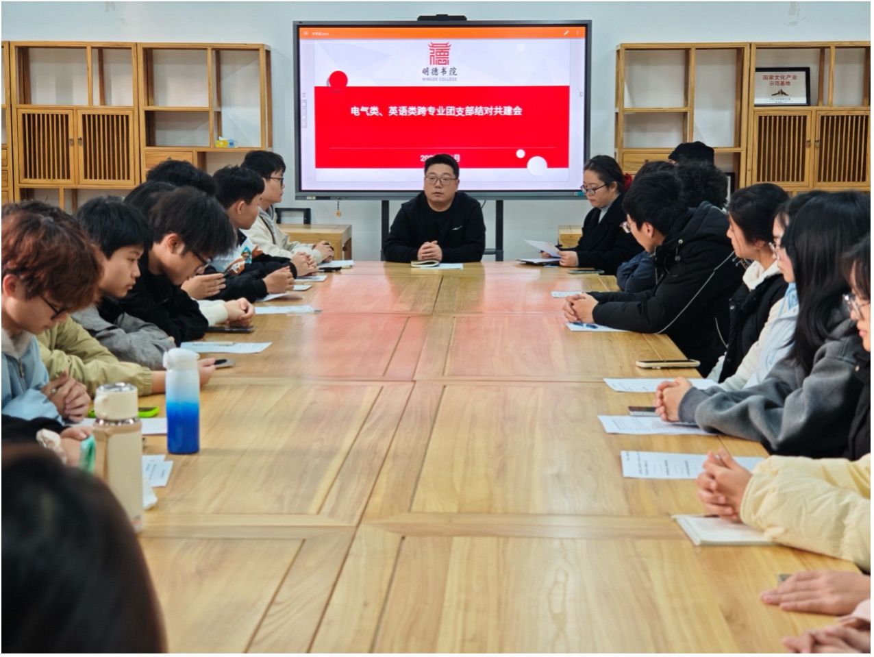 为贯彻落实学校协同育人机制,打破专业界限、推动文理学科融合,实现资源共享、优势互补,12月9日,明德书院跨专业团支部结对共建工作在嵩山路校区实验楼418教室的明德社区人文素养工坊正式启动。书院党委副书记刘飞翔、团委书记刘振伟、辅导员李国根共同参与了书院首个结对团支部——电气工程及其自动化专业2502团支部与英语专业2502团支部的主题团日活动。