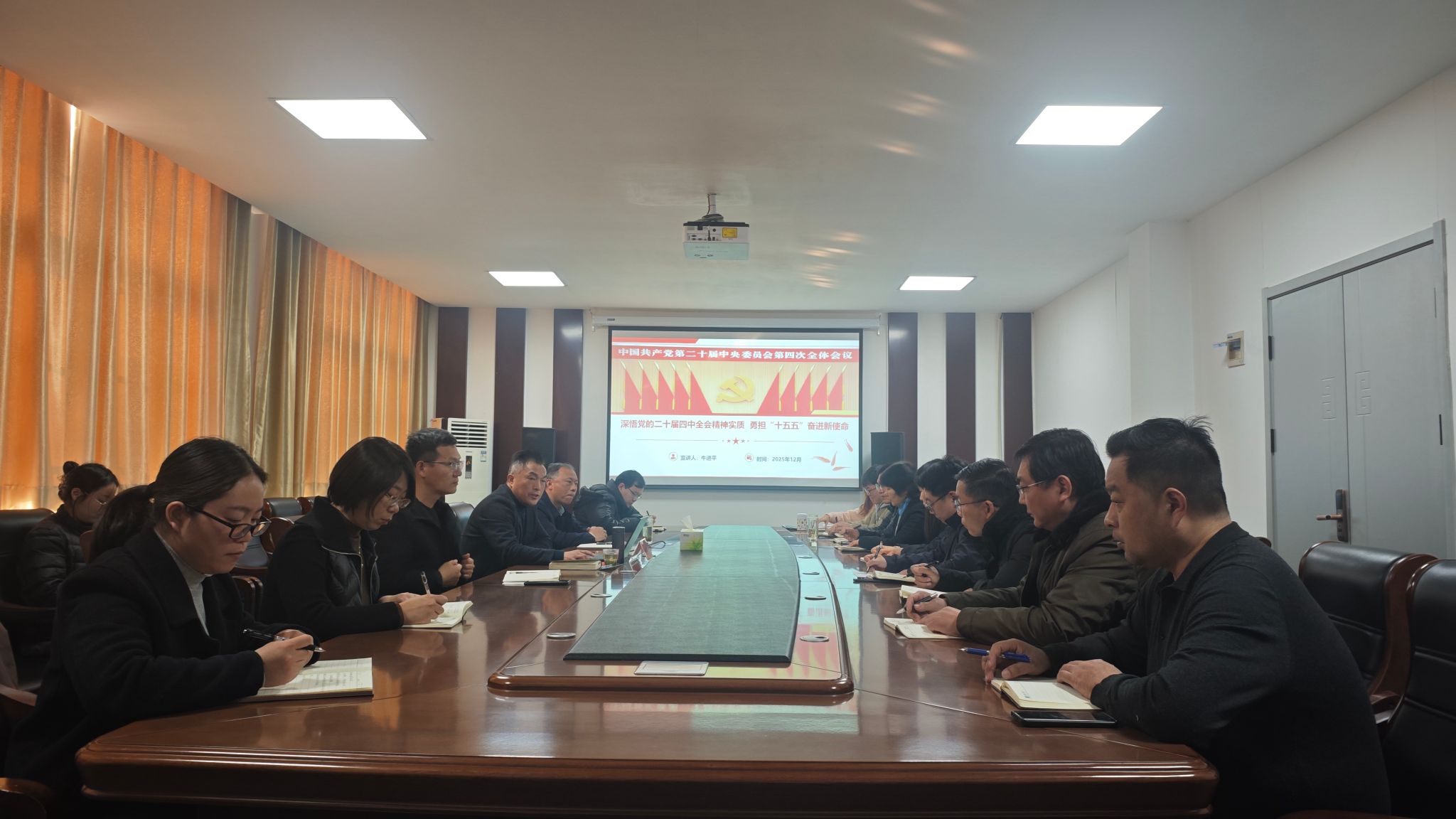 12月19日上午,副校长牛进平以《深悟二十届四中全会精神实质,扛起“十五五”奋进新使命》为主题,在嵩山路校区207会议室为明德书院全体教职工宣讲党的二十届四中全会精神。宣讲会由明德书院党委书记魏朝举主持。