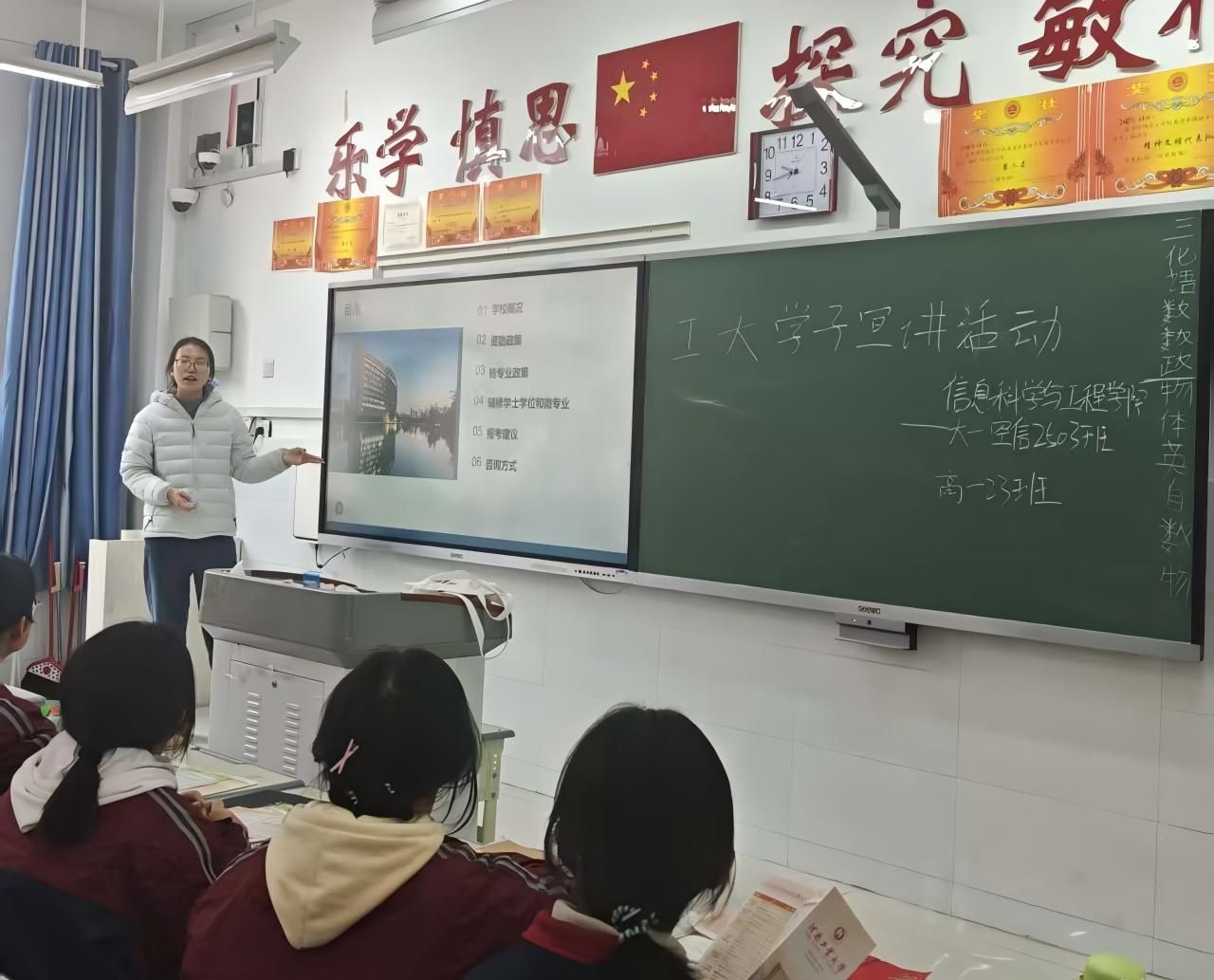 1月28日,空间信息与数字技术专业学子冯晓莹重返高中校园。在班主任的支持下,她以流利而幽默的语言,向学弟学妹们介绍了学校的历史、特色专业及丰富多彩的校园生活,并就大家关心的专业选择、未来规划等问题进行了真诚的交流,活动现场充满了青春的希望与活力。