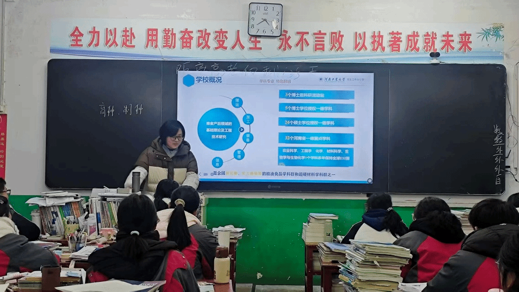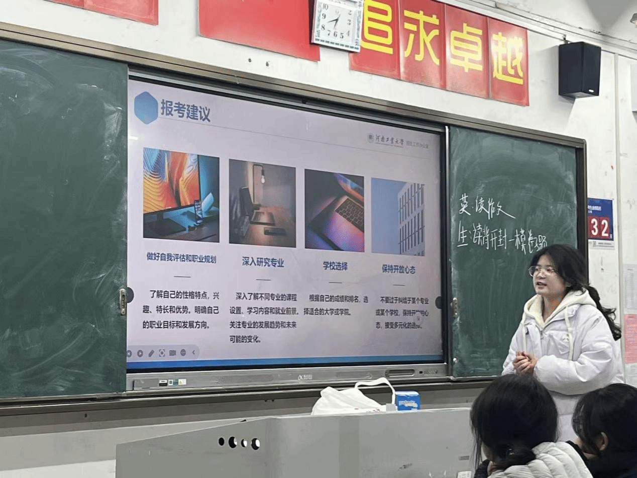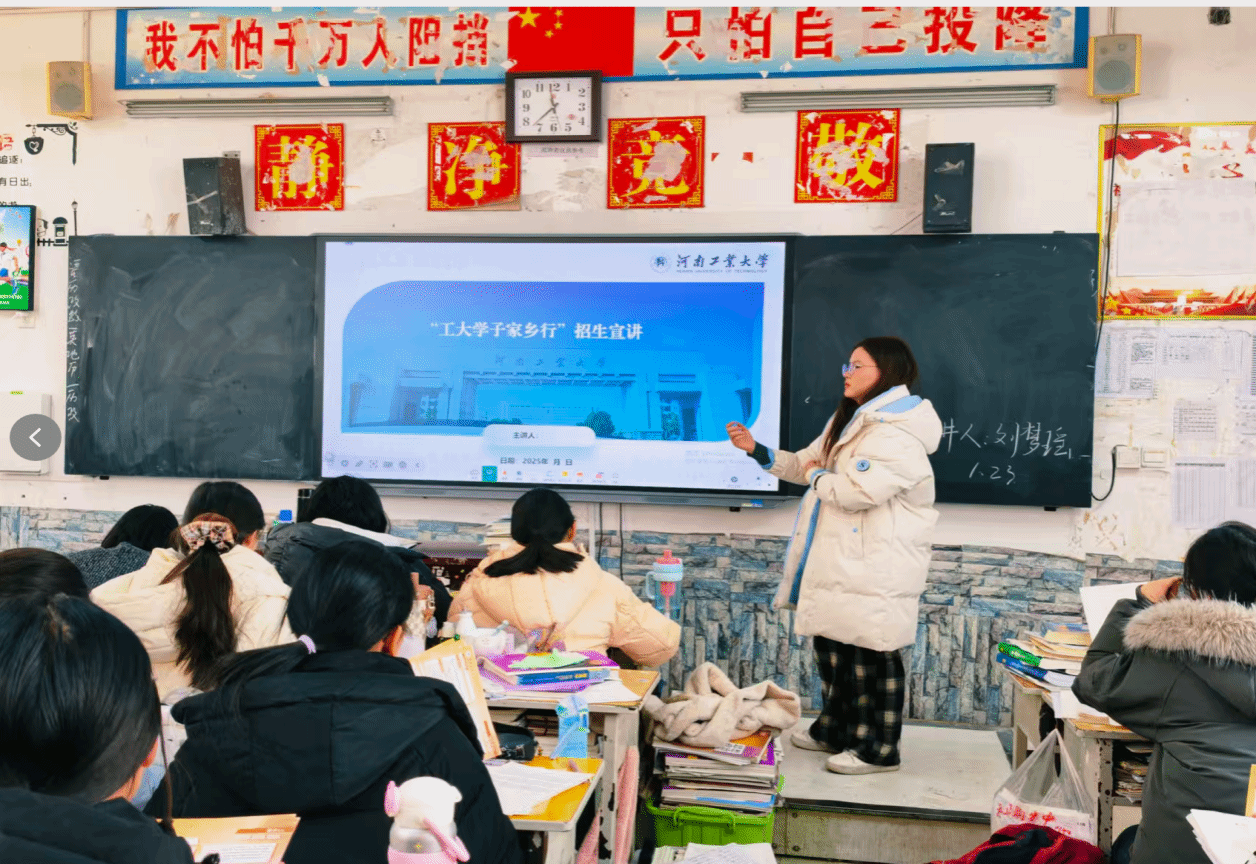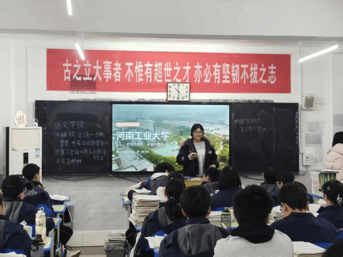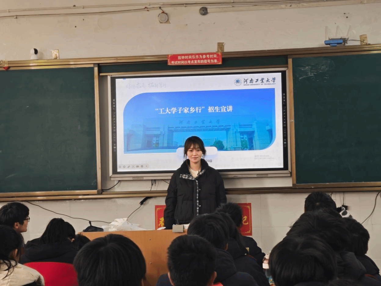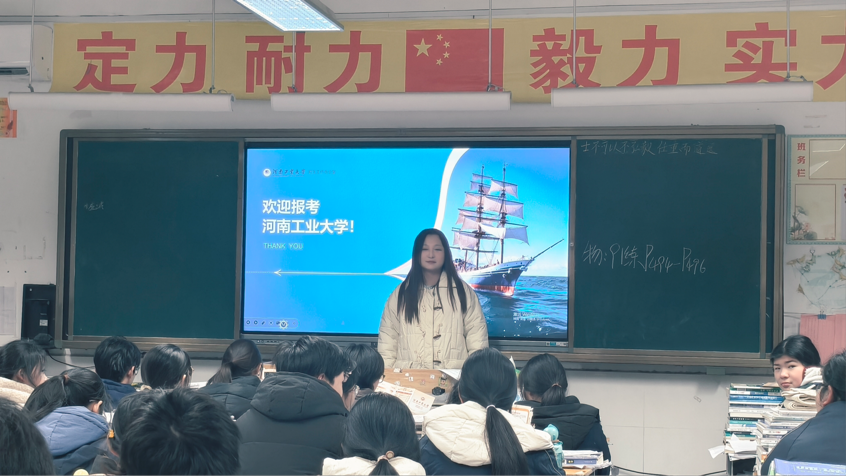 1月26日,贺佳怡同学回到母校洛宁县第一高级中学开展宣讲。活动以“为什么选择河南工业大学”为切入点,她通过专业介绍 PPT 系统展示学校的学科优势、师资力量与人文氛围。贺佳怡结合自身专业发展前景展开介绍,分享从高中到大学的成长经历,就高中阶段的学习规划与备考策略提出具体建议,帮助同学们明确目标、增强信心,让大家深切感受到河工大是汲取知识、全面成长的广阔平台。