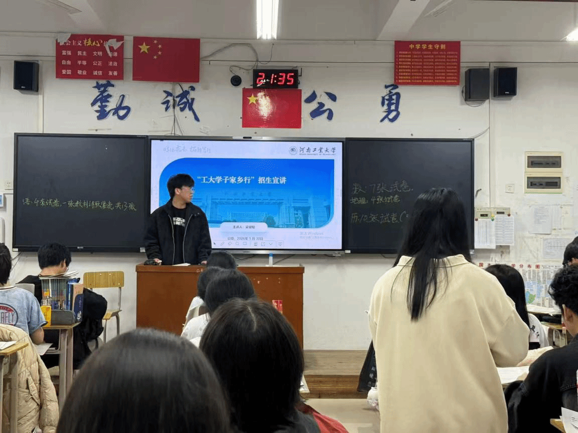 1月26日,学子李雨征踏上回访母校长葛市第一高级中学的旅程。她从河南工业大学的建校历程与发展脉络出发,系统介绍学校的办学特色,通过播放宣传片、展示校园实景照片等方式,生动呈现校园风貌、特色专业设置、转专业政策及资助体系。分享交流环节中,李雨征结合自身经历畅谈大学生活感悟与学习方法,分享备考技巧,鼓励学弟学妹们保持奋进姿态、勇敢追逐理想。