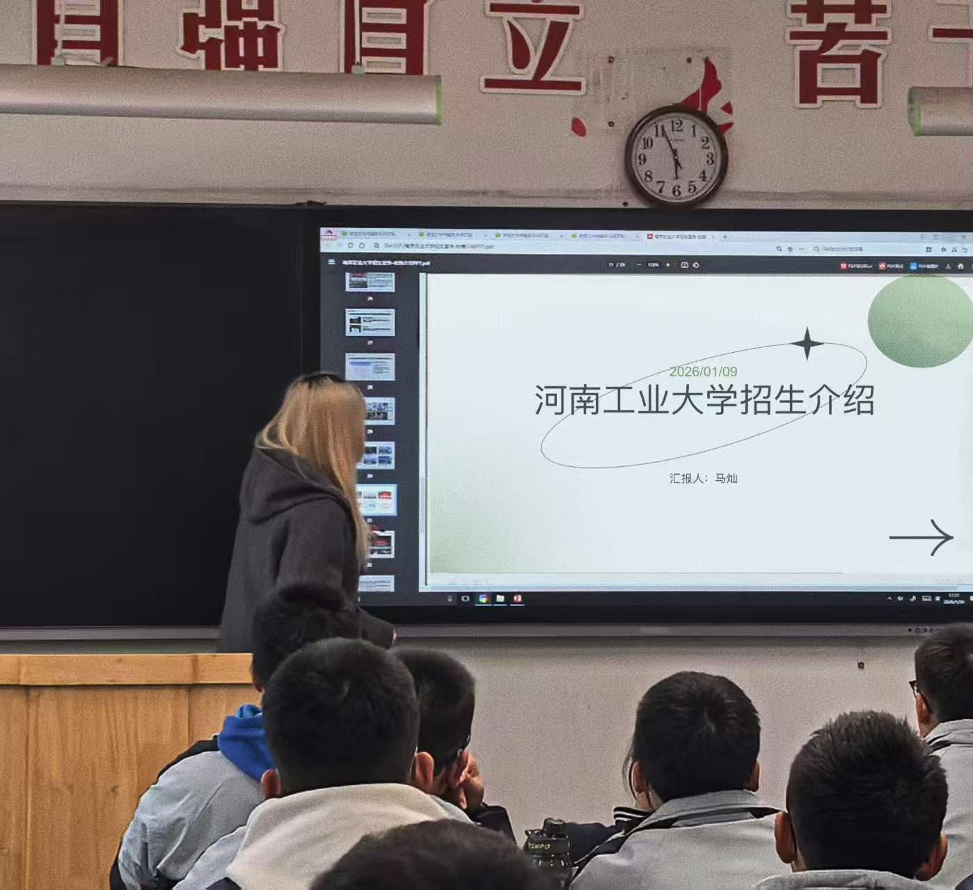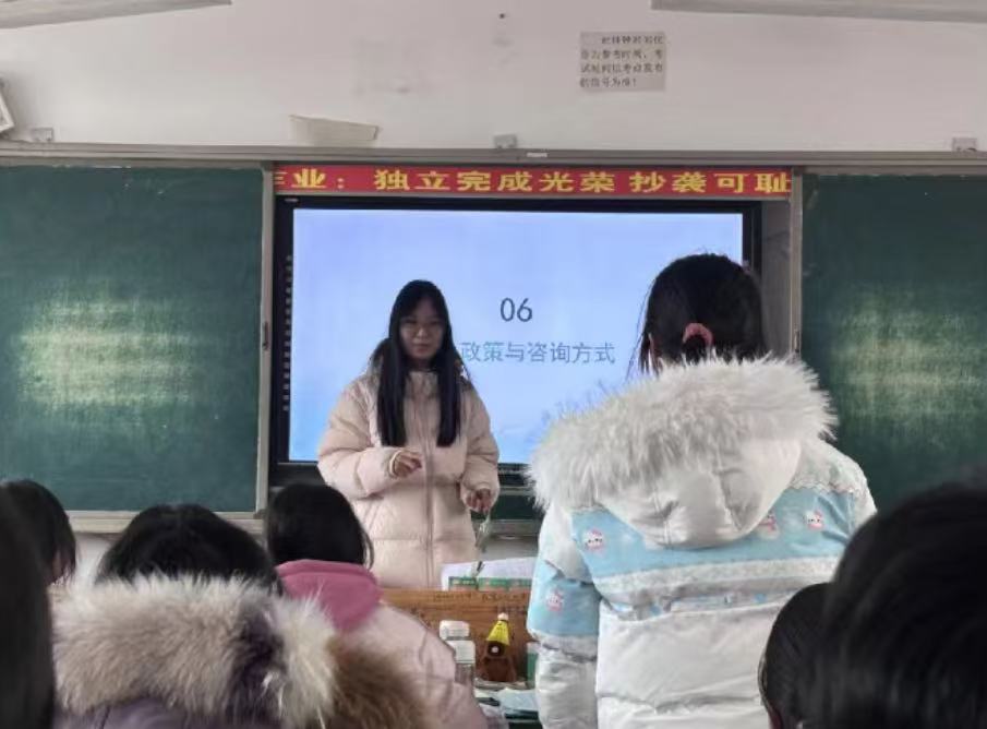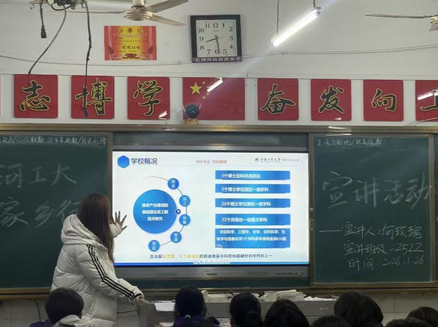 2026年1月26日,大一学子何玫瑰重返高中母校箴言中学,开展主题鲜明的宣讲会。她以“国家粮食安全和制造强国战略” 为切入点,向学弟学妹们介绍学校在绿色食品、装备制造、数字经济等领域的深厚积淀。结合自身在河工大的求学体验,何玫瑰生动分享了大学丰富的社团活动、优质学术资源与多元成长平台,宣讲内容既有严谨的专业解读,又有鲜活的生活趣事,让在场同学对大学生活充满无限向往。