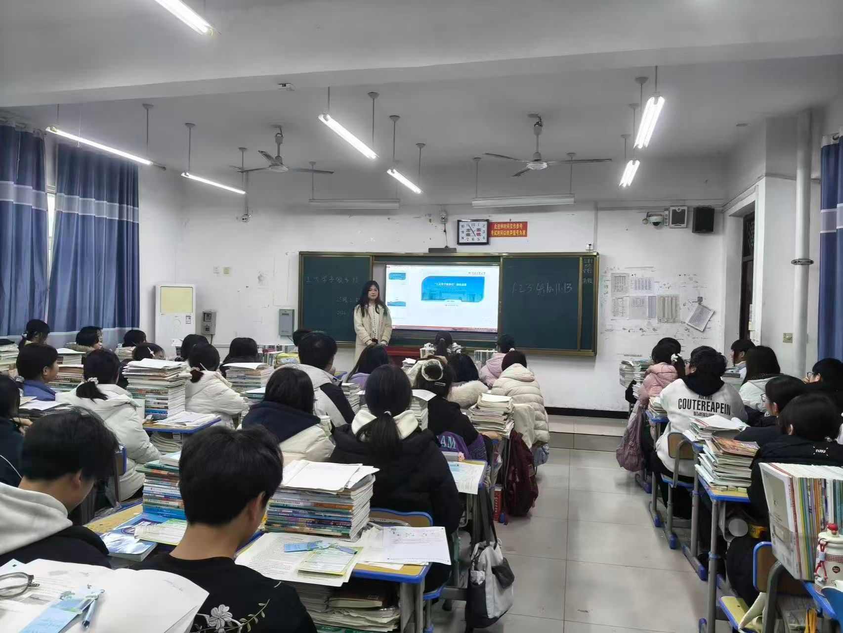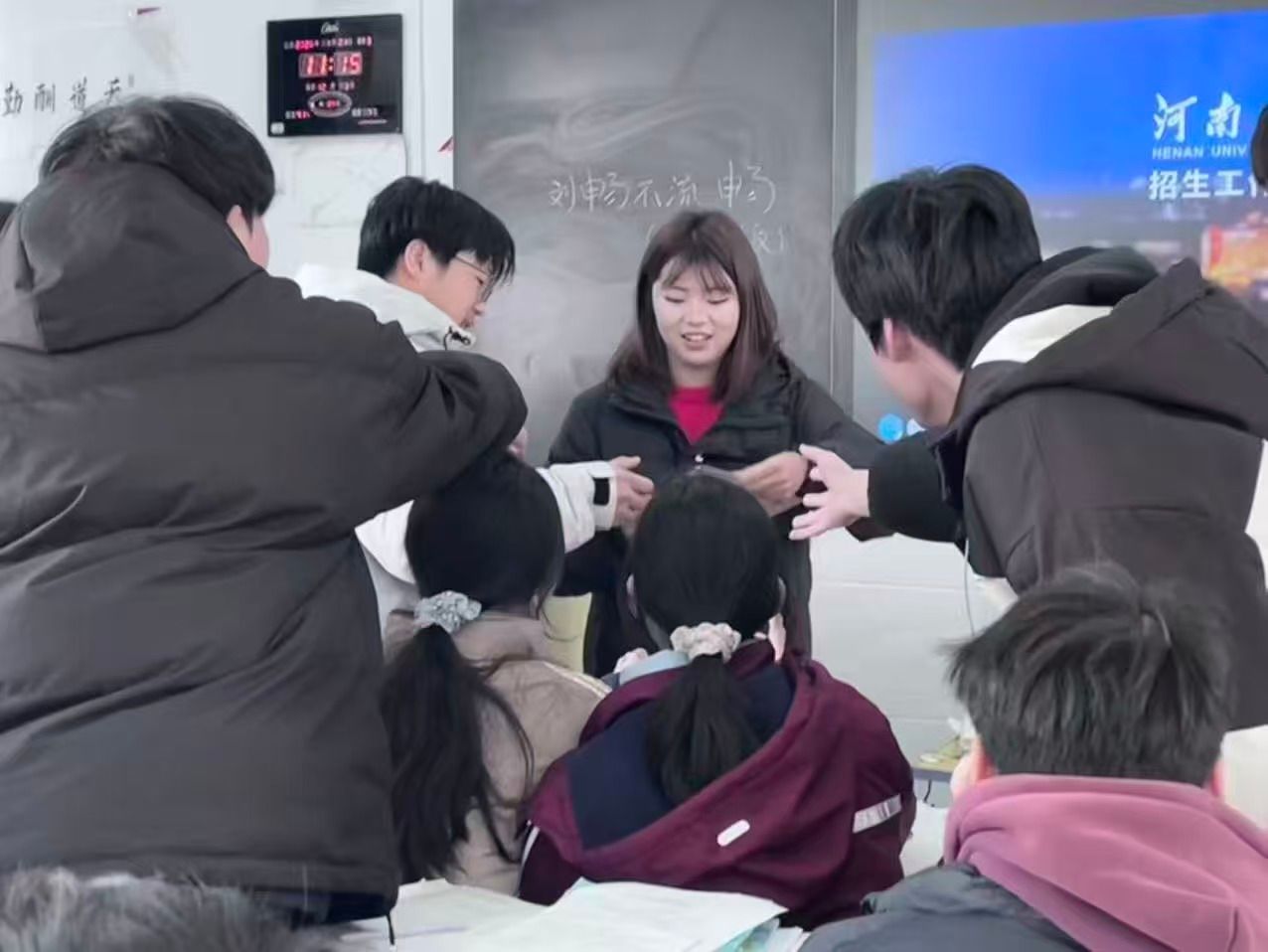 寒假返乡后,新传学子韩湘茹借着 “工大学子家乡行” 的契机,站在了高中母校的教室里,将自己在工大的成长故事与播音专业的日常,娓娓讲给台下的学弟学妹。开场时,她直接掏出手机展示校园生活照片,分享播音生清晨 6 点练声的日常,以及社团招新、校园主持活动的精彩视频。互动环节中,她主动把话筒递给同学们,认真倾听疑问,以个人亲身经历逐一答疑解惑。宣讲尾声,韩湘茹深情表示:“这次回到母校,我不仅是‘宣讲人’,更是‘传声筒’。希望把工大的温度传递给家乡的学弟学妹,让他们知道:远方的大学其实离他们很近,心里的梦想只要敢追就有回响。”