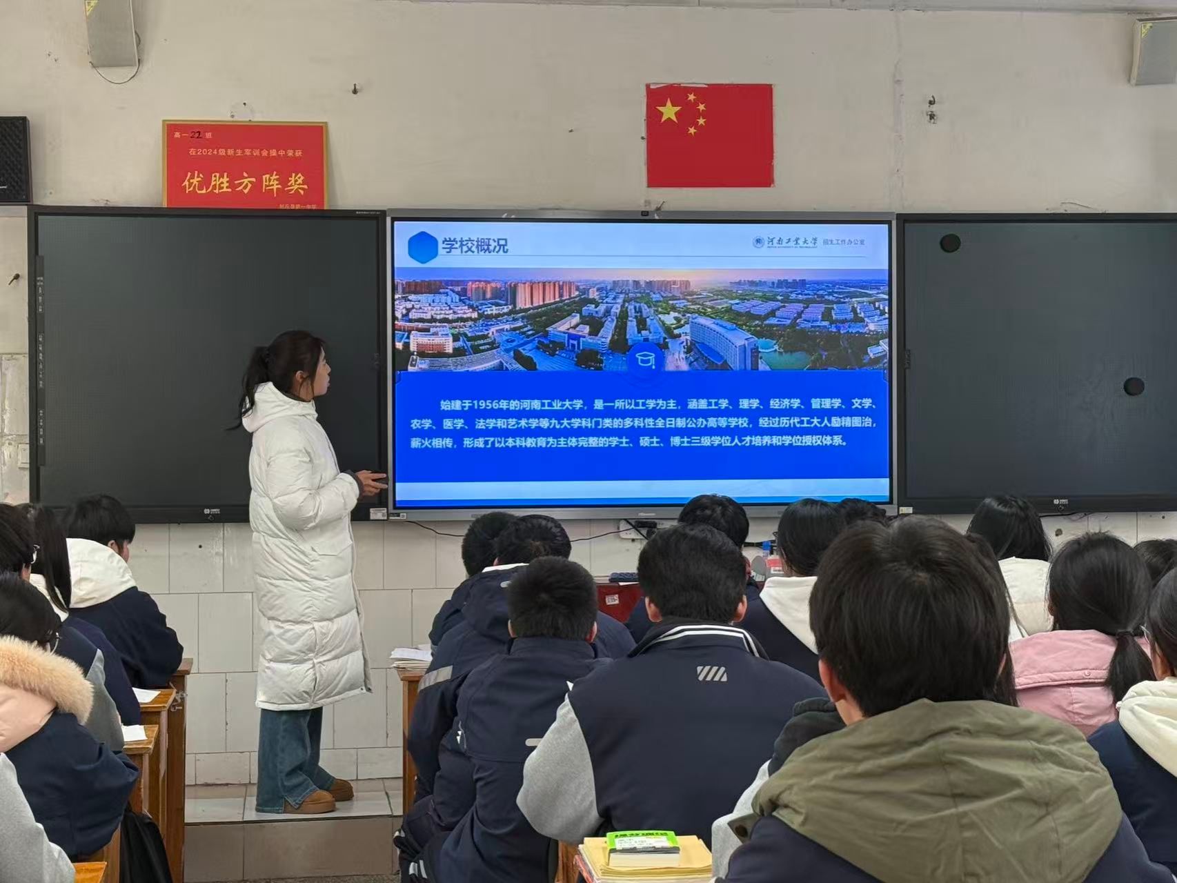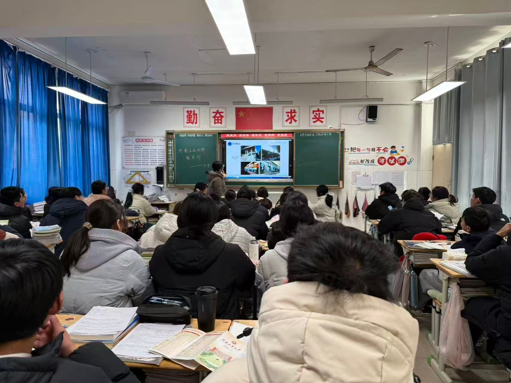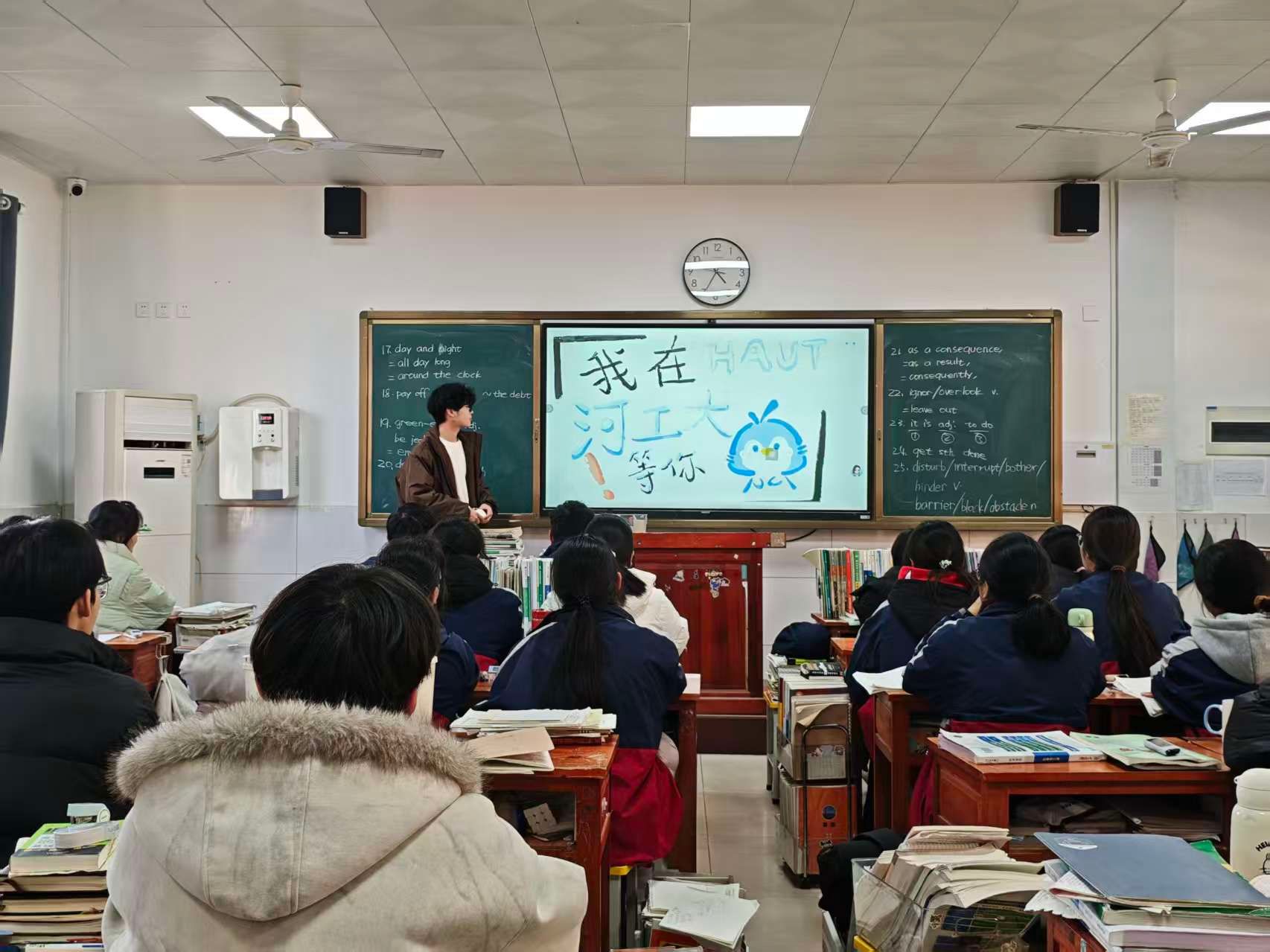 1月24日,侯果果借寒假返乡之机,回到母校封丘一中开展“工大学子家乡行”宣讲。她通过精彩的校园视频与详实的PPT,向学弟学妹全方位展示河南工业大学的校园环境、丰富的文化生活及优质的食宿条件,重点解读学校的专业优势、地理位置与报考相关政策。互动环节中,侯果果耐心回应同学们的各类疑问,并现场分发工大定制文创产品。这场宣讲让高中生对大学生活有了更直观的认知,也传递了工大游子反哺母校的真挚情怀。