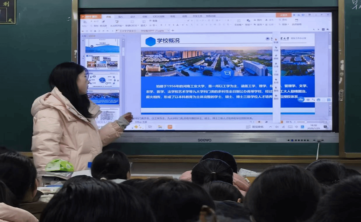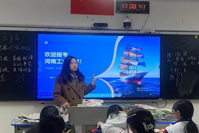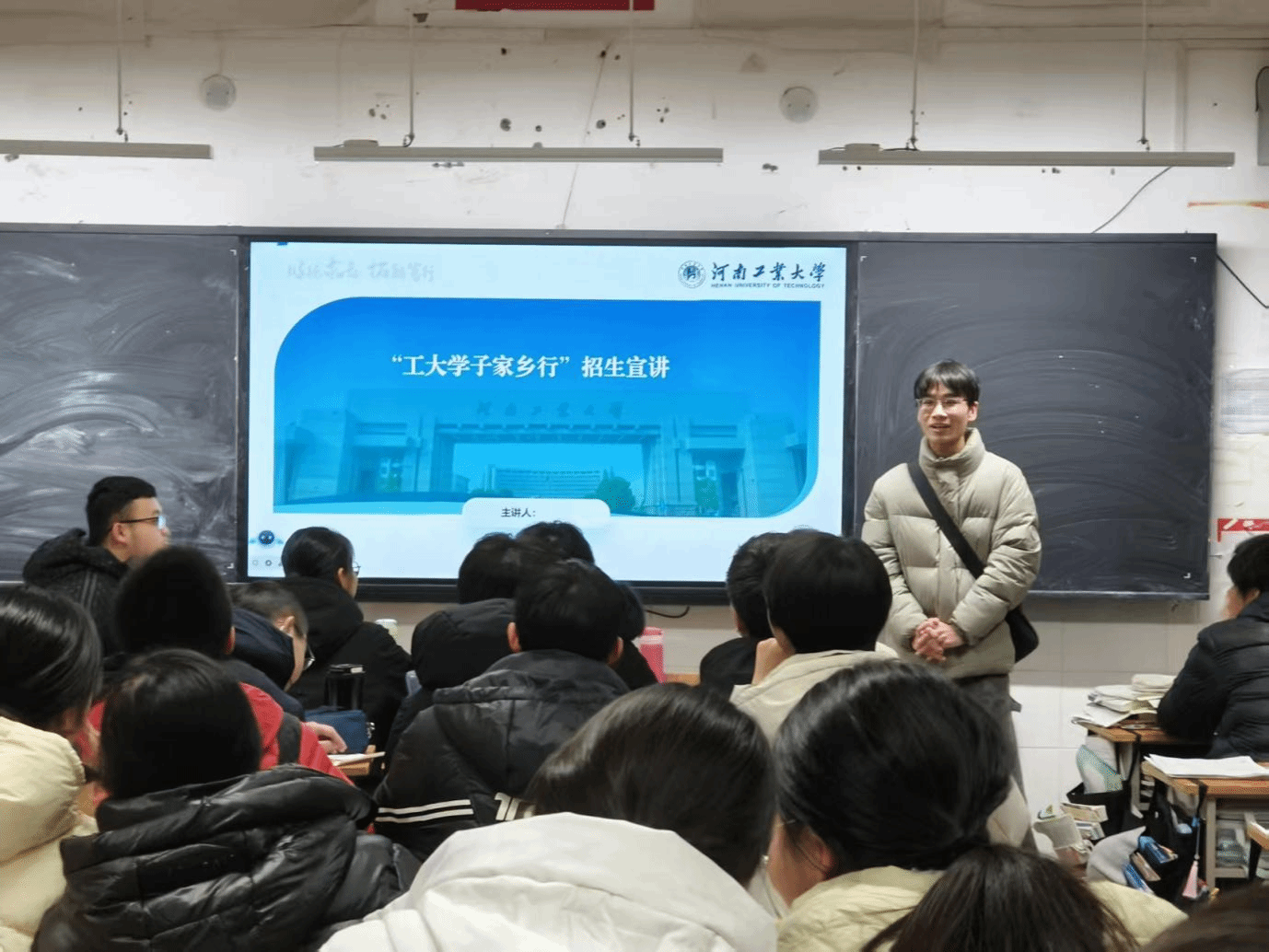 1月23日,人工智能专业2509班宋诗雨走进新乡市辉县市孟庄中学,为该校师生及家长带来了一场生动详实的宣讲会。宣讲会上,宋诗雨首先以一段精心制作的河南工业大学校园宣传片拉开序幕,通过镜头带领在场师生沉浸式感受工大优美的校园风光、现代化的教学设施与浓厚的学术氛围。随后,她围绕学校概况、学科专业、人才培养、资助政策等方面展开详细介绍,从学校实力亮点,到暖心资助政策,再到灵活发展渠道,无一不吸引着同学们的目光。