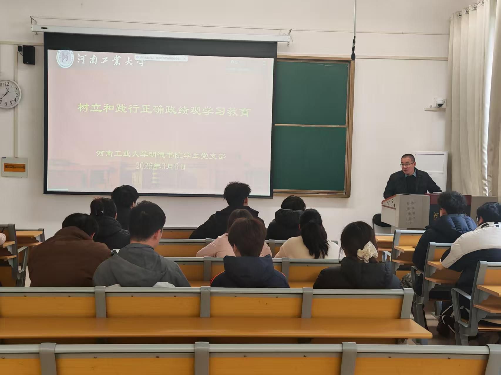 为深入学习贯彻习近平新时代中国特色社会主义思想,落实学校关于在全校党员中开展树立和践行正确政绩观学习教育的部署要求,引导学生党员树牢正确政绩观、强化使命担当,3月6日,河南工业大学明德书院学生第一、二、三党支部和国防预备役党支部联合组织全体学生党员开展线上+线下专题学习教育活动,以学铸魂、以学促干,推动学习教育走深走实,切实把学习成果转化为干事创业的实际行动。
