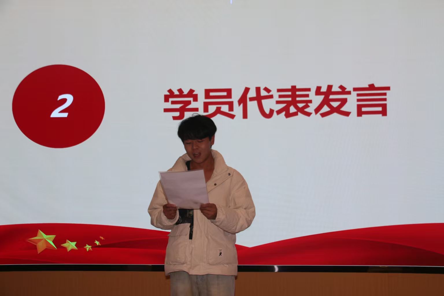 仪式在庄严的《中华人民共和国国歌》声中拉开帷幕。全体人员肃立,目光坚定地注视着前方,齐声高唱国歌,现场氛围庄重而热烈。随后,明德书院张淼同学作为学员代表发言。他表示,分团校是深入学习党的精神、锤炼理想信念的重要平台,同时也是连接人文情怀与青年使命担当的桥梁。他承诺将履行好“服务者”与“同行者”的职责,带领同学们勤学、笃行,充分展现青年的责任与担当。